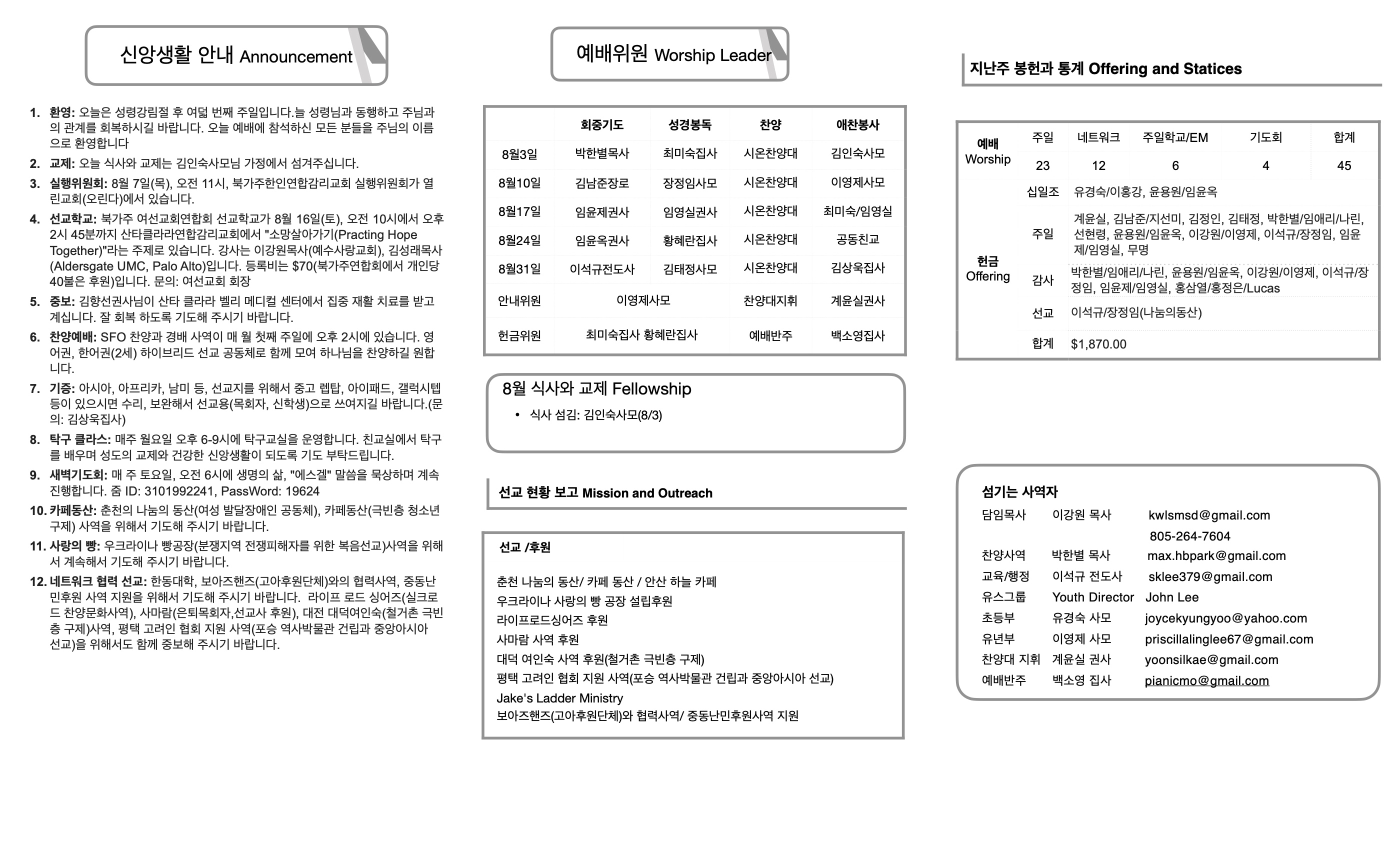 주일 예배 주보_8/3/25 페이지 정보 작성자 예수사랑교회 댓글 0건 조회 1,765회 작성일 25-08-16 20:43 목록 본문 주일 예배 주보_8/3/25 이전글주일 예배 주보_8/10/25 25.08.16 다음글주일 예배 주보_7/27/25 25.08.16 댓글 0 댓글목록 등록된 댓글이 없습니다. 목록