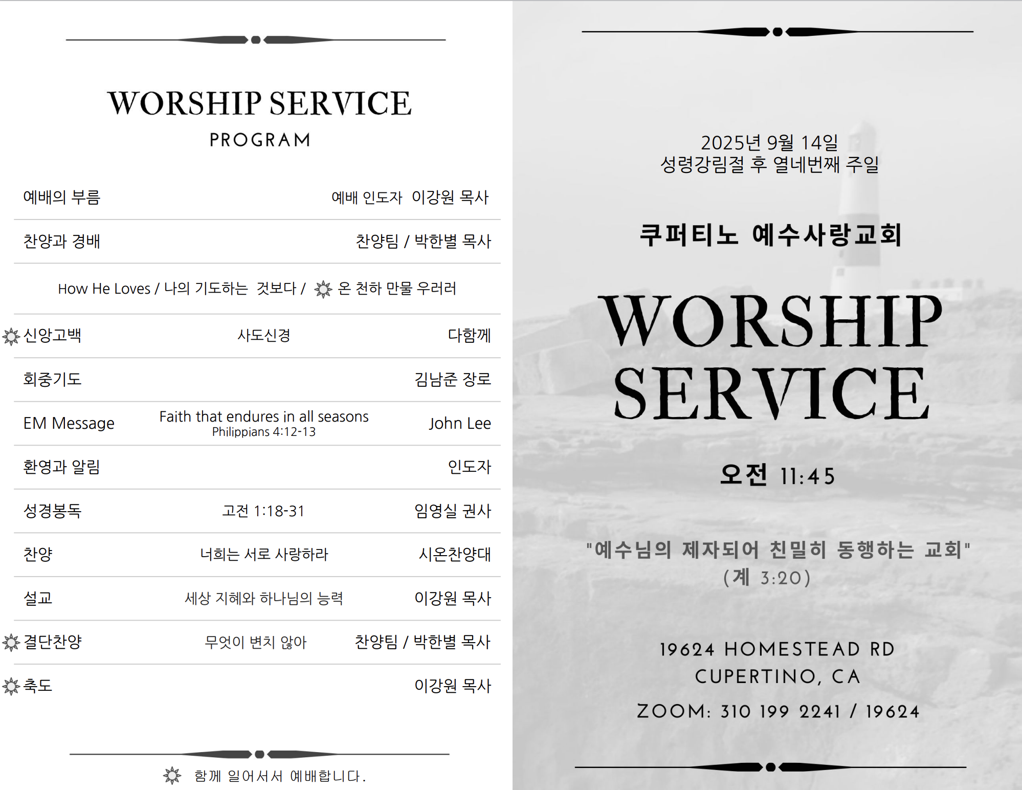 주일 예배 9/14/25 페이지 정보 작성자 예수사랑교회 댓글 0건 조회 1,329회 작성일 25-09-21 20:25 목록 본문 주일 예배 9/14/25 이전글주일 예배 9/21/25 25.09.21 다음글주일 예배 9/7/25 25.09.21 댓글 0 댓글목록 등록된 댓글이 없습니다. 목록